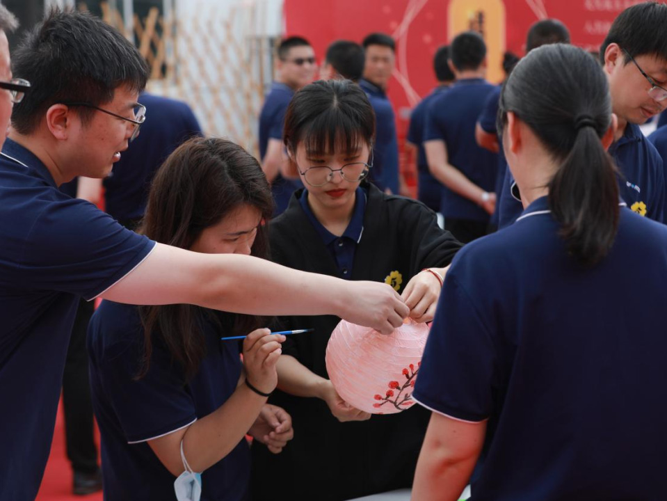 每個(gè)人都在各自分組的月亮燈上畫上圖案色彩,精美的月亮燈掛在活動(dòng)現(xiàn)場(chǎng)的燈籠墻上,